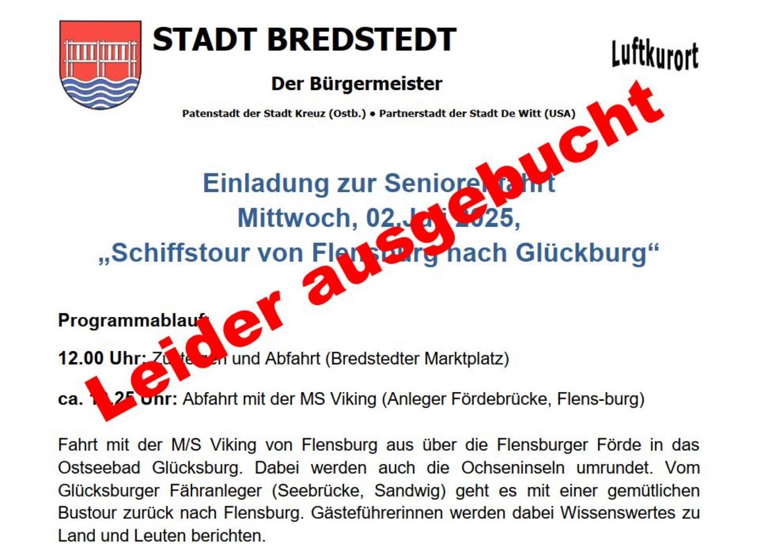 Bredstedt. Die Seniorenfahrt der Stadt Bredstedt ist bereits ausgebucht. Das Interesse an den rund 100 Tickets war so groß, dass schon jetzt alle Plätze für die Fahrt am 02. Juli vergeben sind. Die Organisator:innen bedanken sich für den Zuspruch und bitten all jene um Verständnis, die leider nicht dabei sein können.