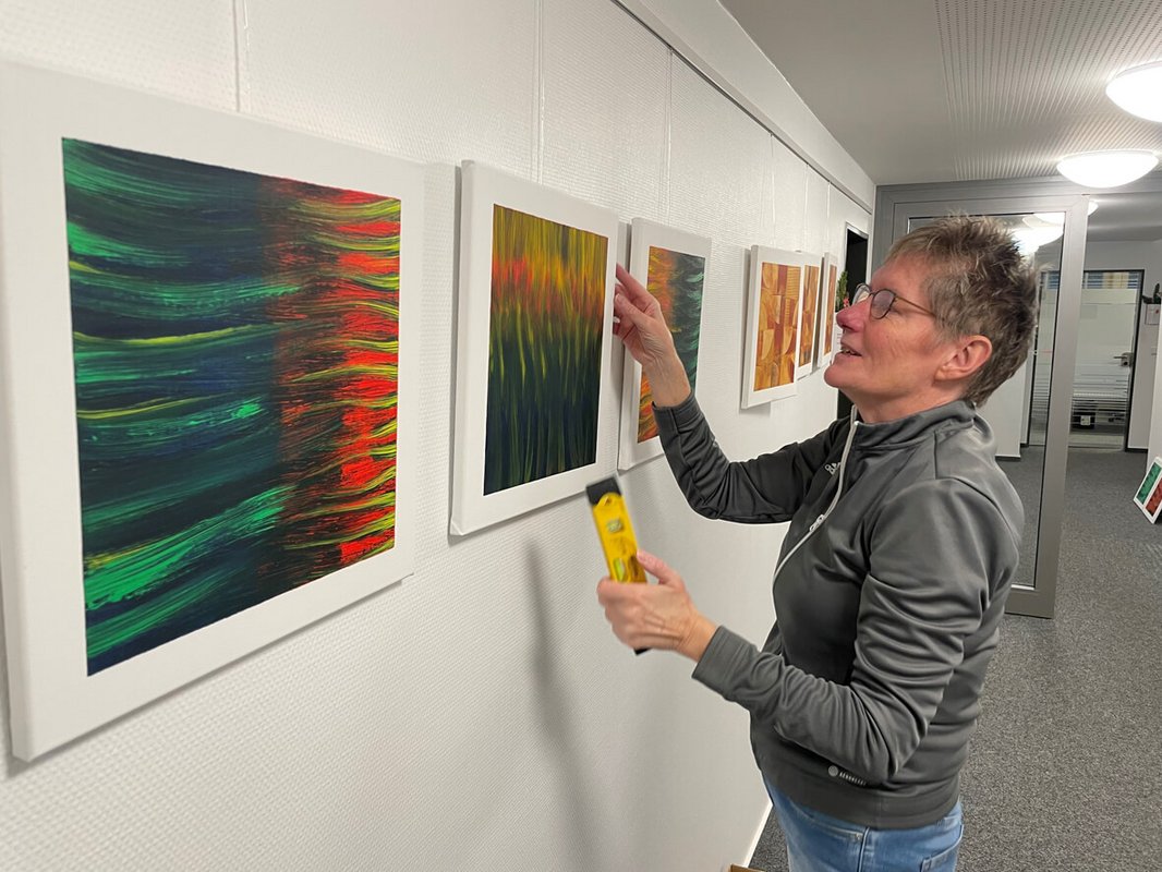 Bredstedt. „Jetzt wird’s bunt“, sagt Susanne Weber zu ihrer aktuellen Ausstellung im Amt Mittleres Nordfriesland. Die farbenfrohe Vielfalt ihrer Bilder fällt Betrachtenden sofort ins Auge. Im Obergeschoß der Verwaltung zieren 35 Werke im Format 40x40 Zentimeter den langgestreckten Flur auf beiden Seiten. Leuchtende Flächen in prächtigen Acrylfarben hat die Lindewitter Künstlerin gestaltet. Keines ihrer abstrakten Bilder ist wie das Andere, und doch bilden sie in ihrer Breite ein harmonisches Bild und zeigen sich gewissermaßen jeweils als Teil einer großen „Familie“.