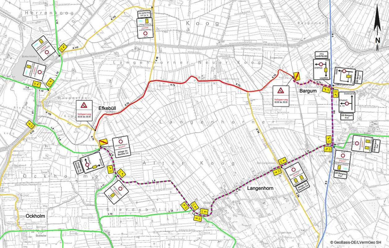Die ausgeschilderte Umleitung für alle Bauabschnitte führt ab Bargum über die Bundesstraße 5 zur L 13 (Dorfstraße) durch Langenhorn sowie die L 6 Richtung Efkebüll zur K 73. Der LBV.SH bittet, sich auf die Arbeiten einzustellen, den ausgeschilderten Umleitungen zu folgen sowie um rücksichtsvolles Verhalten zum Schutz der Menschen auf den Baustellen.