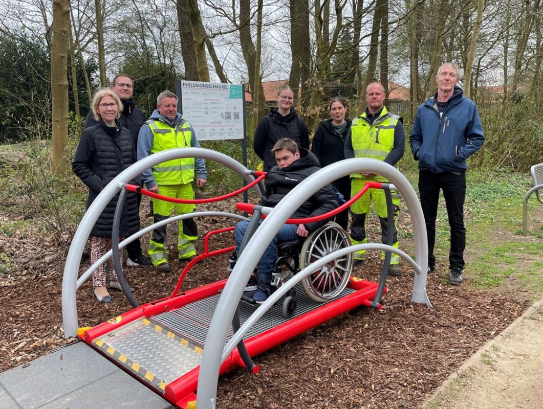 Bredstedt. Der Bewegungsbereich im Bredstedter Sparkassenpark am Mühlenteich ist um eine Attraktion reicher. Eine sogenannte Inklusionsschaukel ergänzt die bereits vorhandenen Outdoor Fitnessgeräte nahe der Boulebahn und dem Kinderspielplatz. Diese besondere Schaukel können auch Menschen im Rollstuhl eigenständig nutzen. Sie bietet zudem ausreichend Platz für Begleitpersonen.