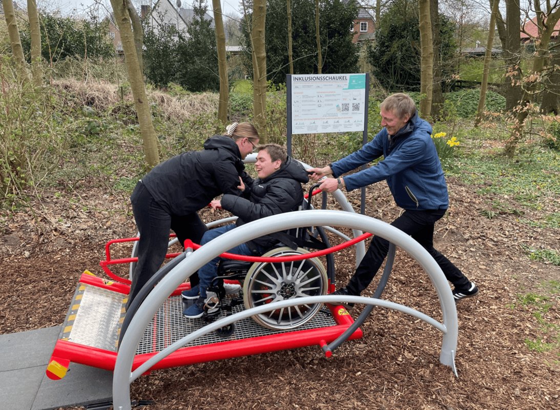 Kürzlich haben bereits Bewohnerinnen und Bewohner des Hauses am Mühlenteich die neue Inklusionsschaukel ausgiebig getestet. „Wir waren begeistert und kommen gerne wieder“, freut sich Einrichtungsleitung Ivonne Christiansen. Gemeinsam mit dem Ergotherapeuten-Team war eine kleine Gruppe zum Spielplatz gegangen, um alles auszuprobieren. „Ob mit oder ohne Rollstuhl, die Schaukel macht richtig Spaß, ist leicht zu bedienen und sieht mit ihrer modernen Gestaltung nicht nur schick, sondern auch sehr stabil aus.“ Die neben der Schaukel stehende Tafel mit Erläuterungen sei gut verständlich und habe den Einstieg erleichtert, so Ivonne Christiansen weiter. „Eine Assistenzkraft sollte beim ersten Mal dennoch unbedingt dabei sein.“