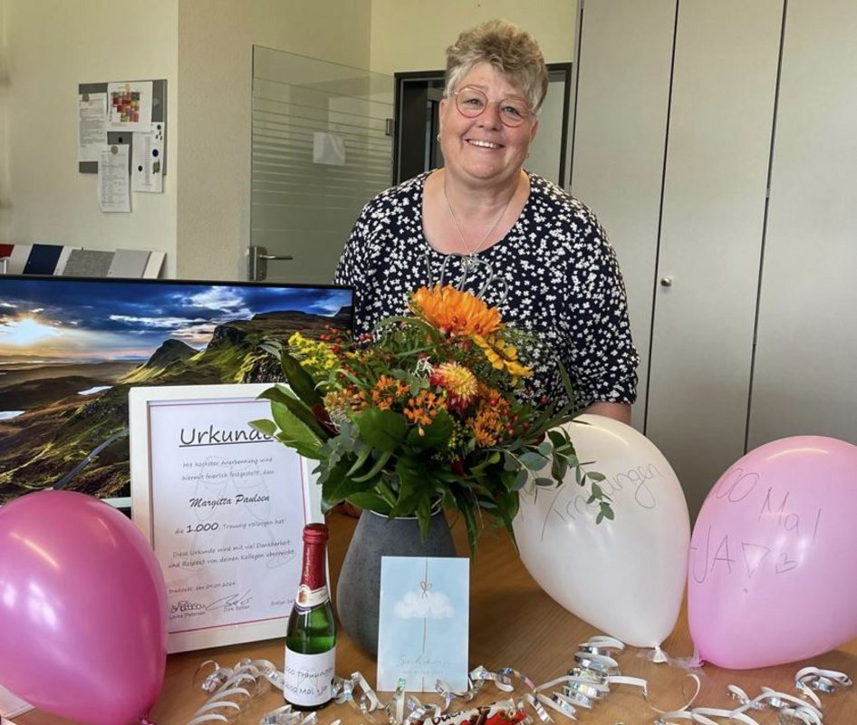 In der Amtsverwaltung gab es im Anschluss eine kleine persönliche Ehrung von den standesamtlichen Kolleginnen und Kollegen. Ein schön geschmückter Schreibtisch, Blumen und eine Urkunde warteten auf die Rekordträgerin.